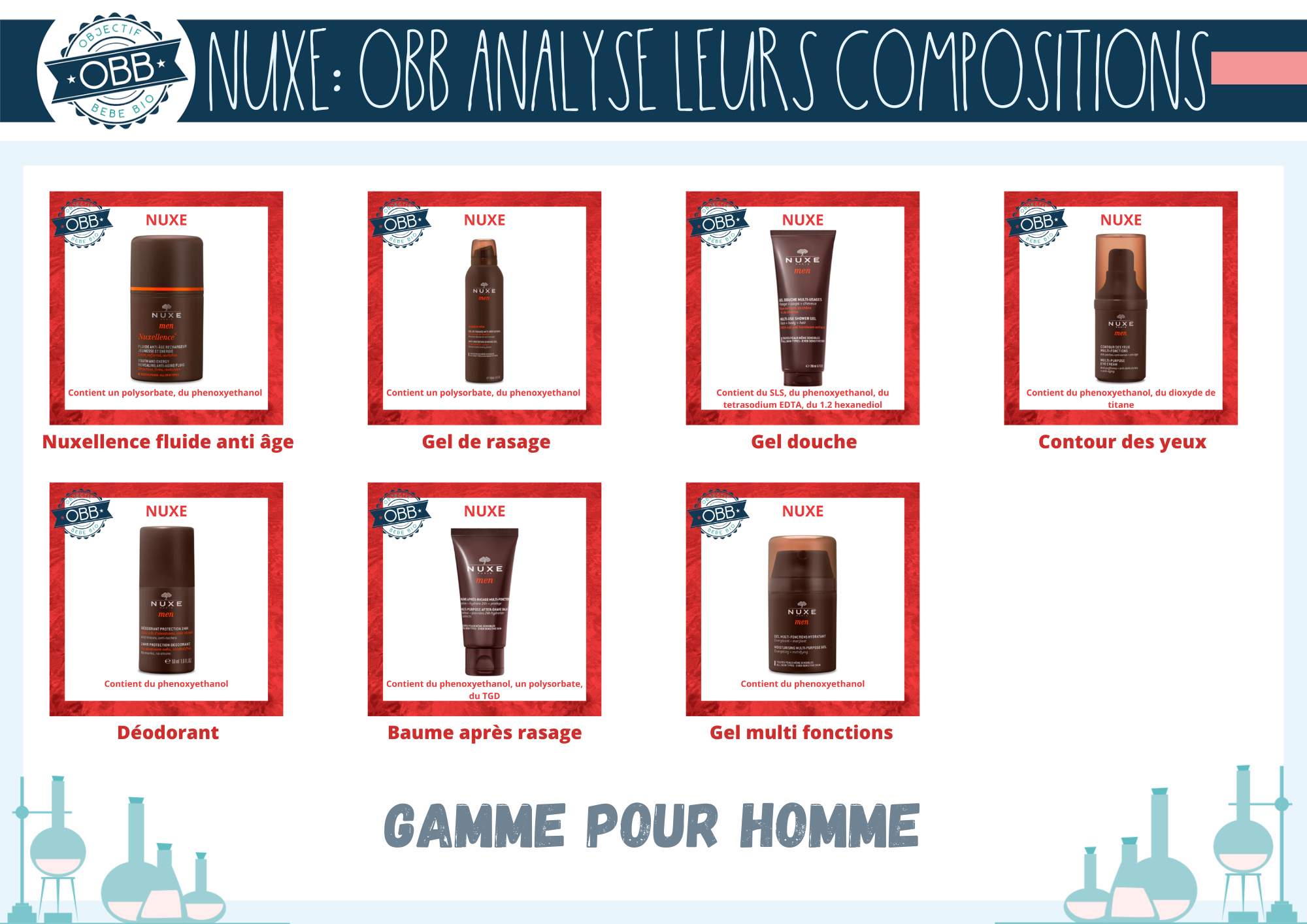 Nuxe propose aussi des produits pour homme, avec par exemple une crème de rasage et d’autres références pour prendre soin de la barbe. Tous les produits de cette gamme contiennent du phenoxyethanol.