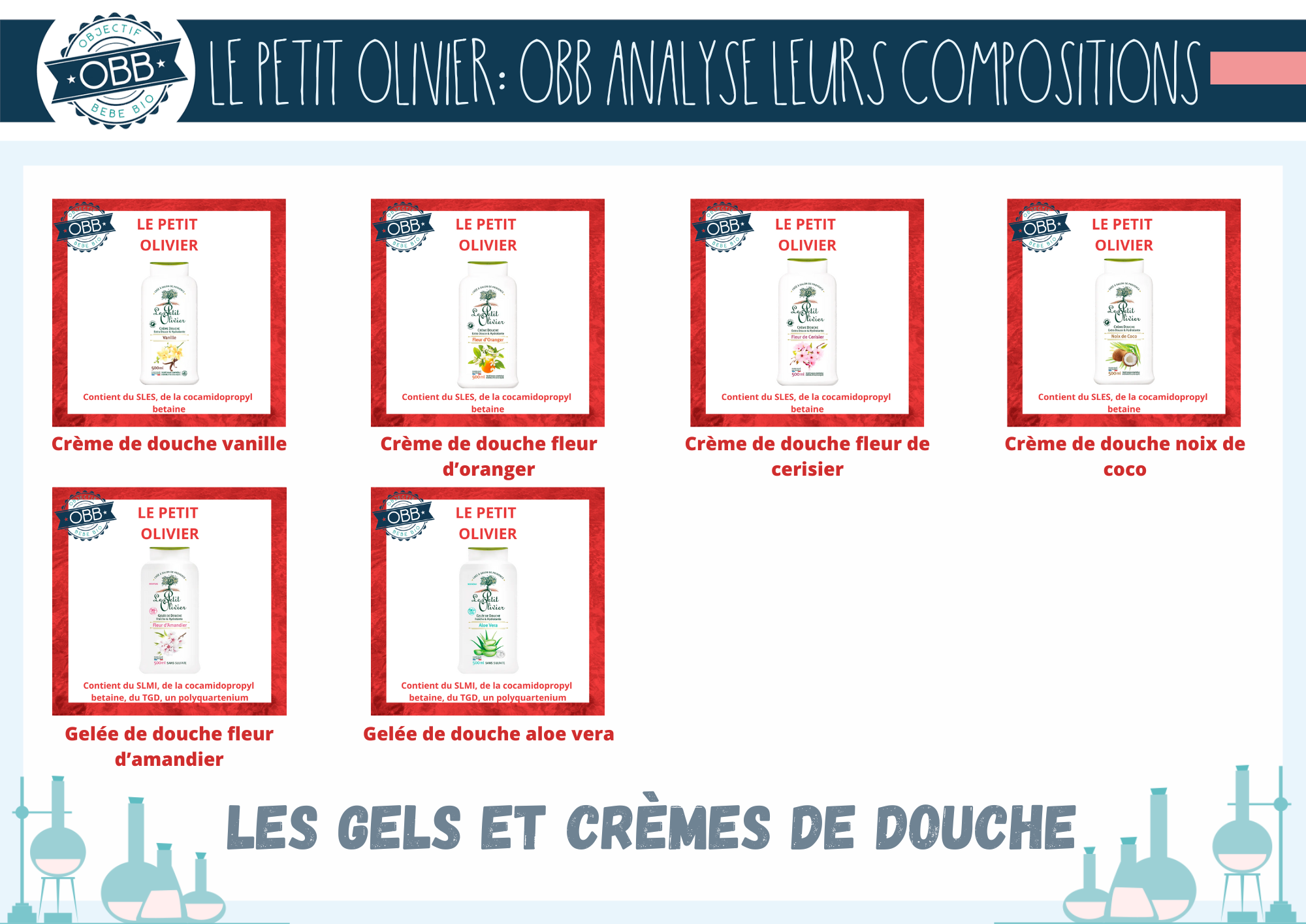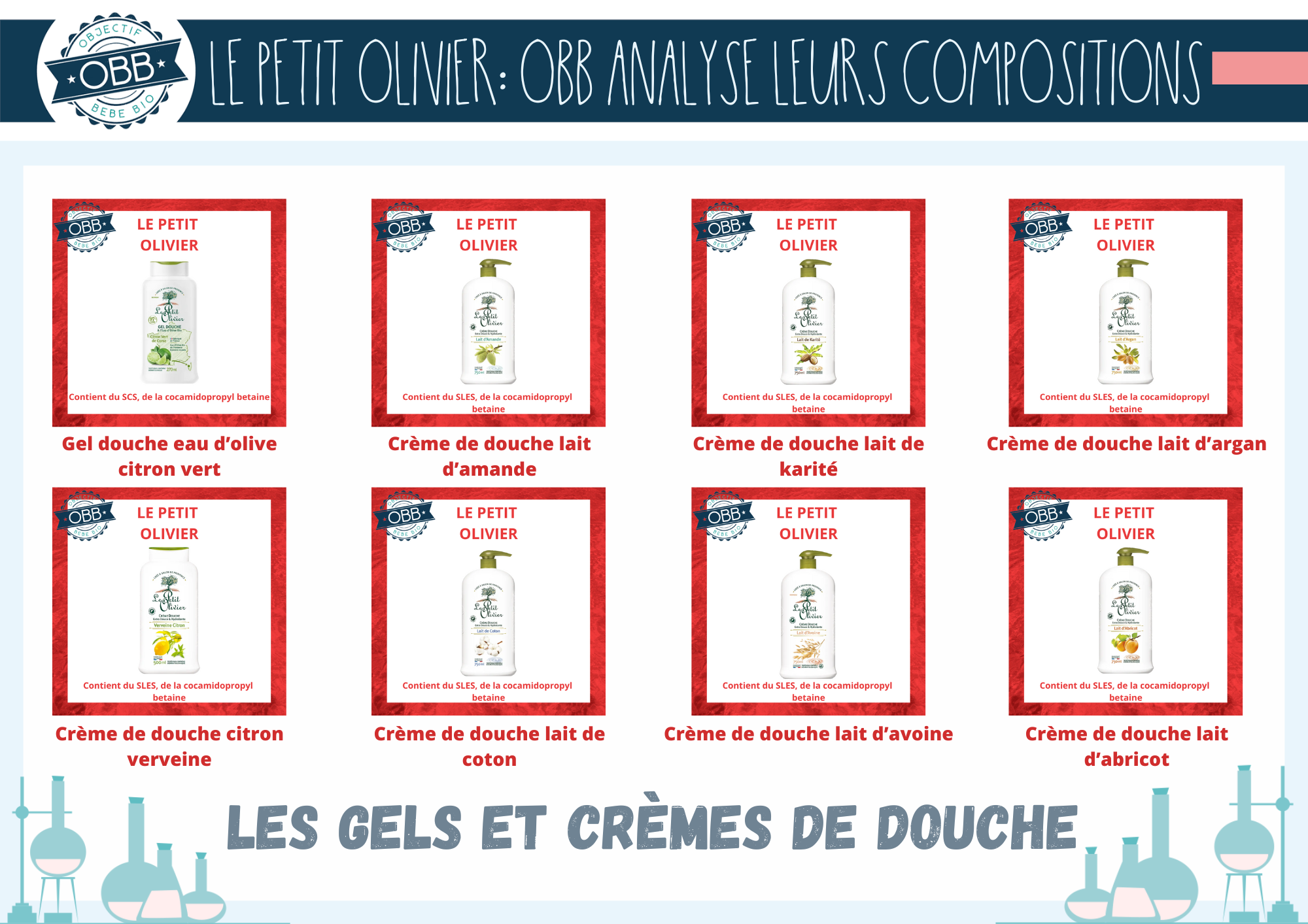 Pour terminer voici les nouveautés développées par le Petit Olivier: la gamme dédiée aux bébés. Elle est composée d’un liniment, d’une eau nettoyante et d’un gel lavant. A l’instar des autres produits lavants de la marque, ce dernier contient un tensioactif irritant.