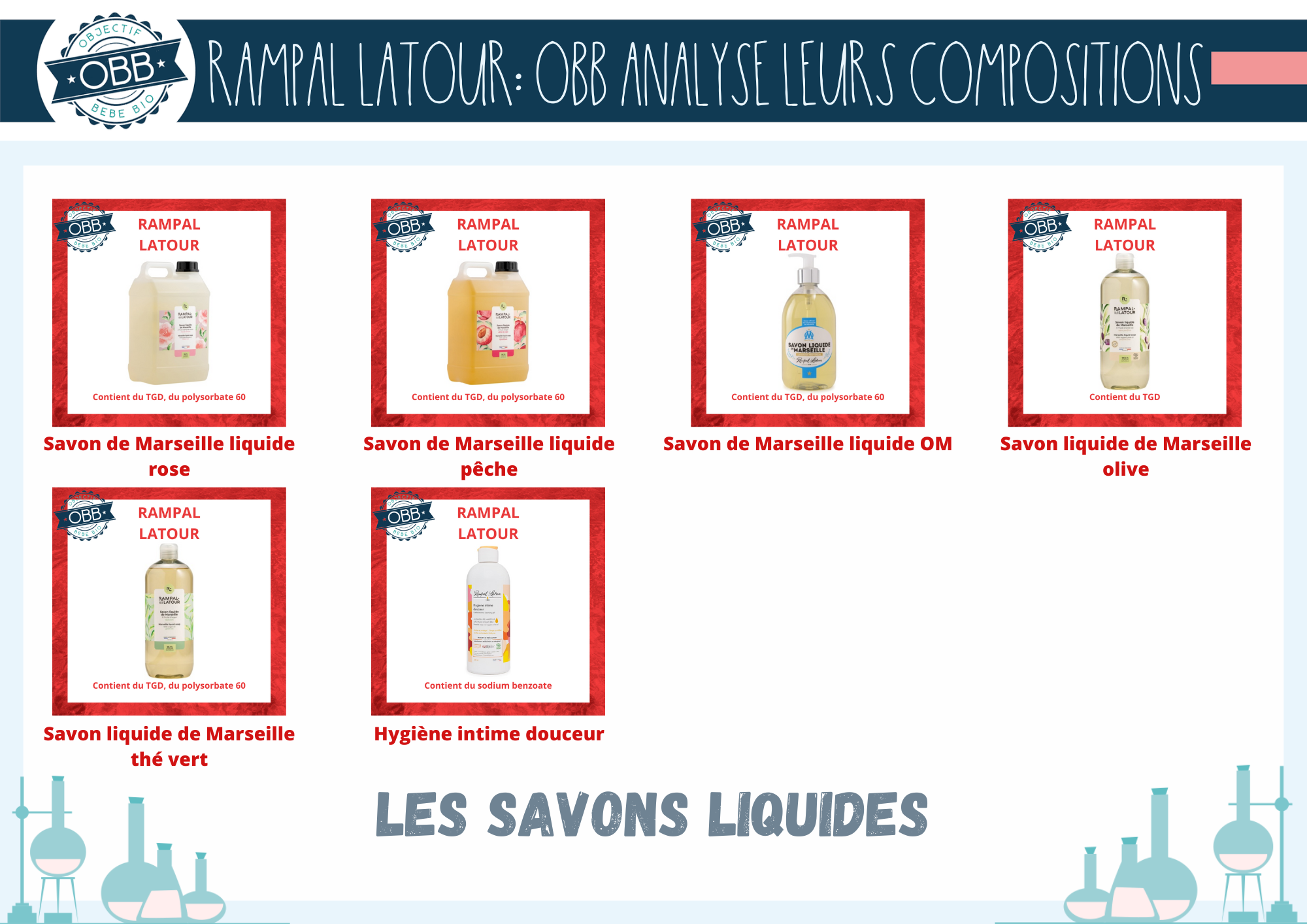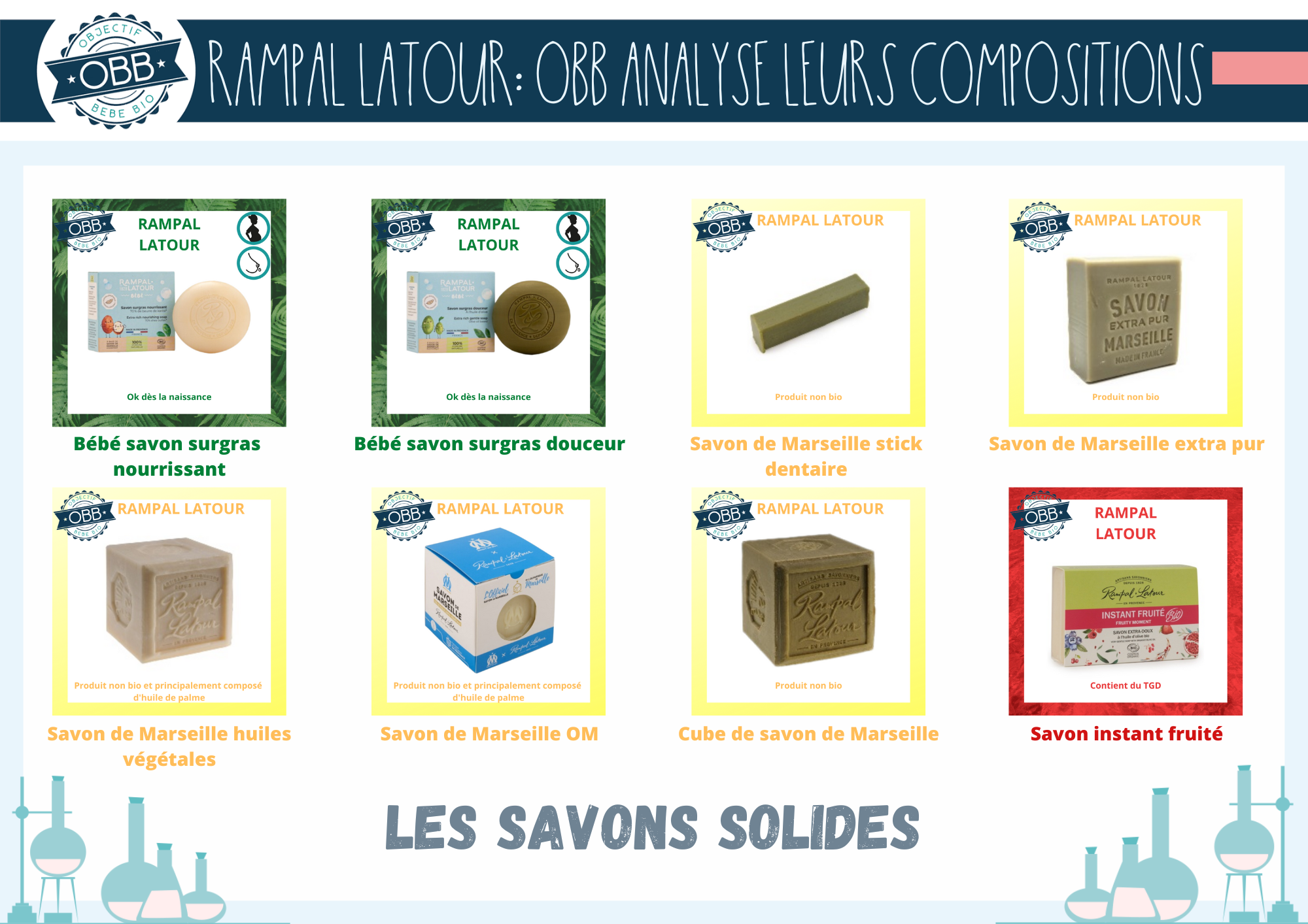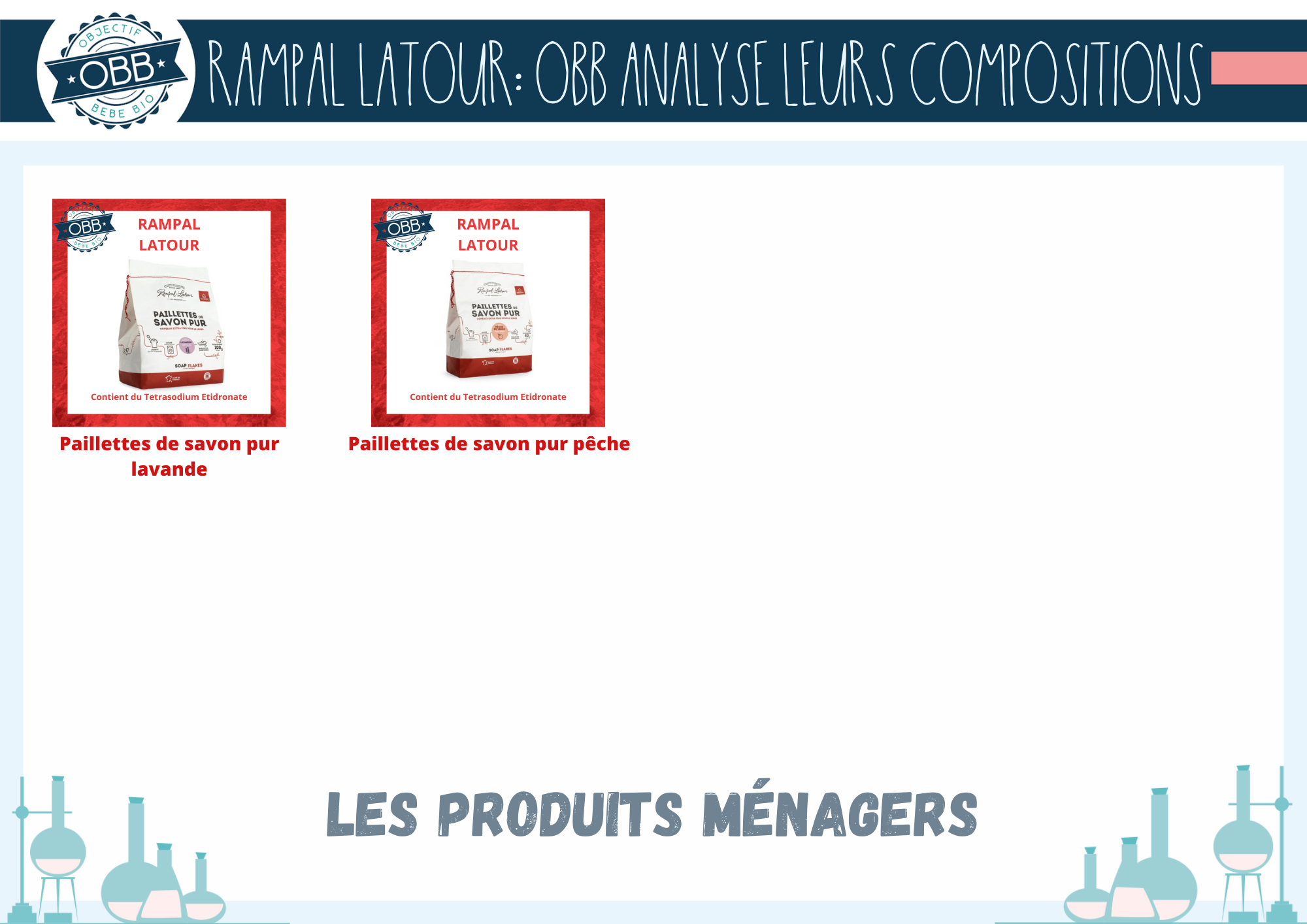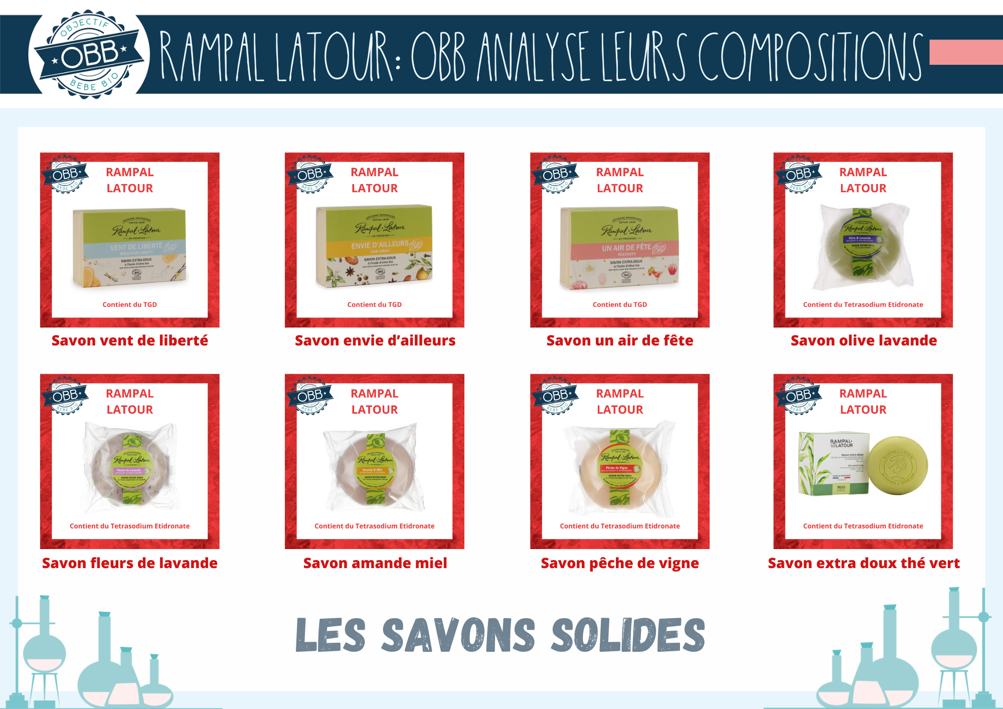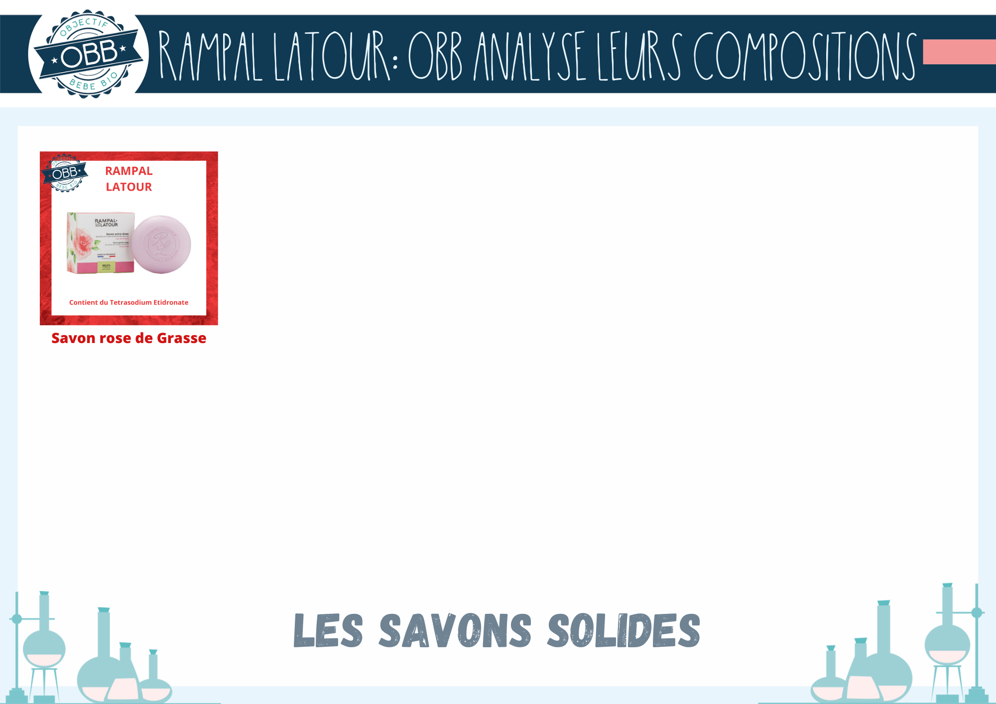Nous commençons par les produits phares de la marque: les savons solides. Rampal Latour, propose deux savons surgras pour bébé, qui sont également compatibles avec la grossesse et l’allaitement, qui sont en accord avec notre cahier des charges. Les barres et cubes de savon de Marseille ne contiennent pas d’ingrédients problématiques mais ils ne sont pas biologiques. Les autres savons contiennent du TGD ou du tetrasodium etidronate.