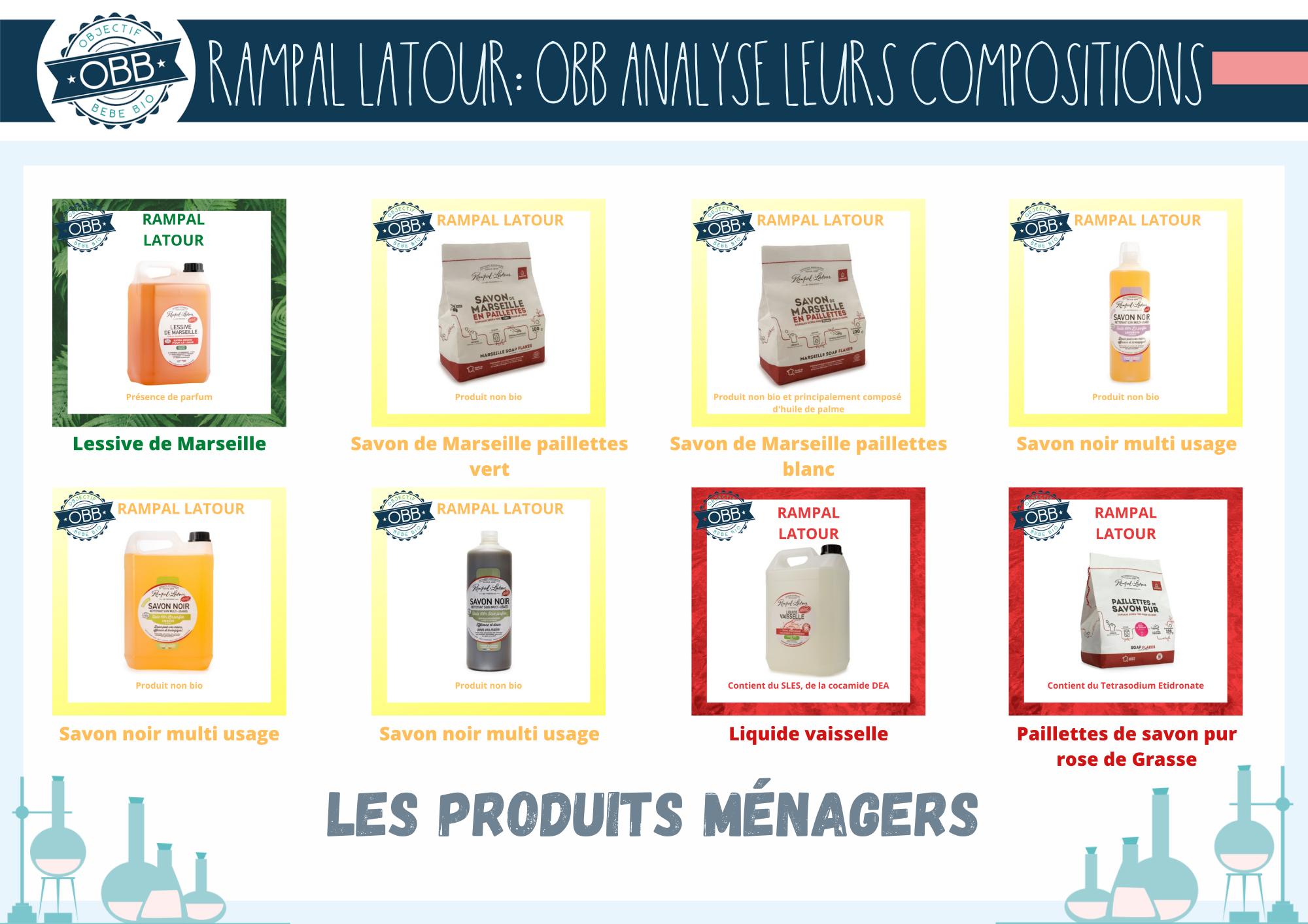 Nous commençons par les produits phares de la marque: les savons solides. Rampal Latour, propose deux savons surgras pour bébé, qui sont également compatibles avec la grossesse et l’allaitement, qui sont en accord avec notre cahier des charges. Les barres et cubes de savon de Marseille ne contiennent pas d’ingrédients problématiques mais ils ne sont pas biologiques. Les autres savons contiennent du TGD ou du tetrasodium etidronate.