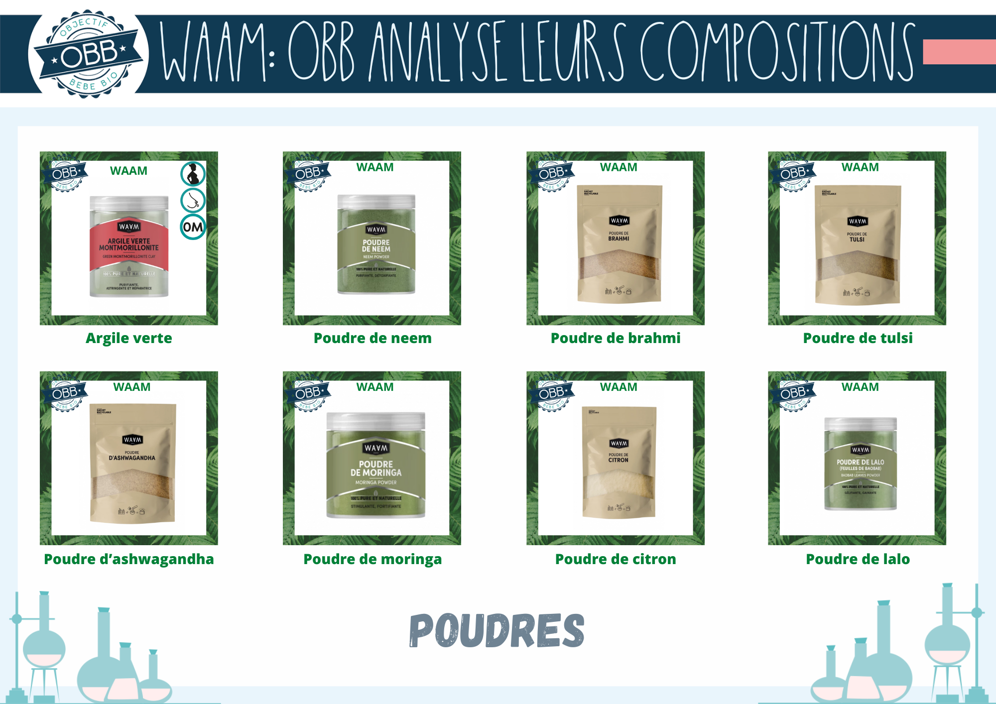 Il est tant de découvrir les produits les plus originaux de la marque: les formats poudres. En effet Waam propose différents produits nettoyants et masques pour le visage sous forme de poudre à reconstituer. Le shampoing et le gel douche sont compatibles avec la grossesse, l’allaitement et les enfants de plus de 3ans.