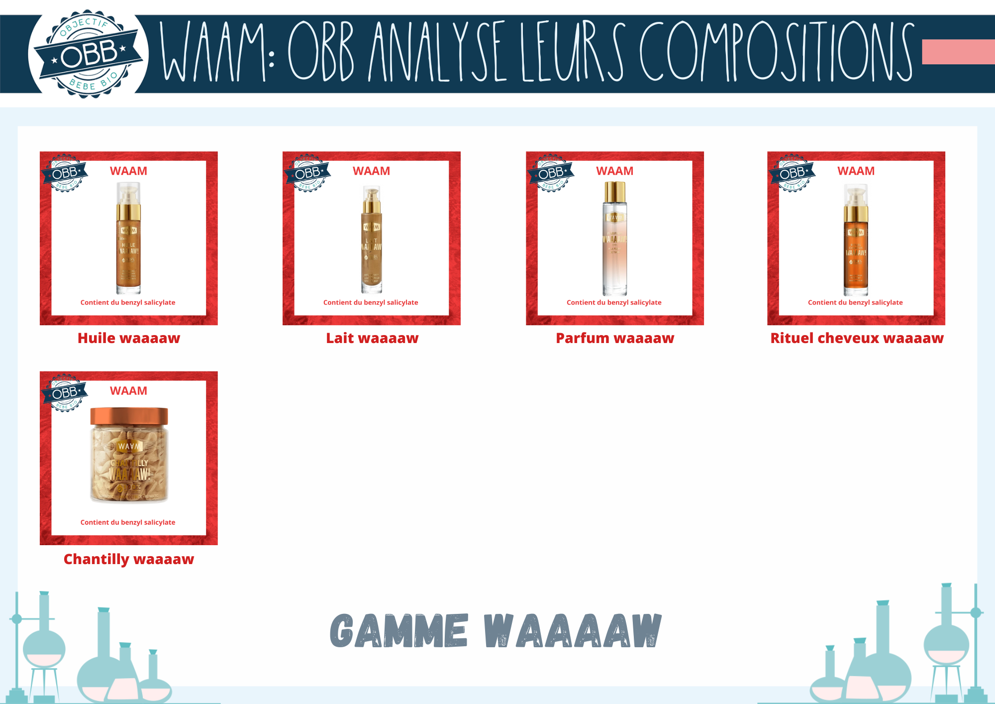La gamme waaaaw a été créé en collaboration avec la bloggeuse Peau neuve. Toutes les références contiennent du benzyl salicylate qui est irritant et surtout un perturbateur endocrinien suspecté.