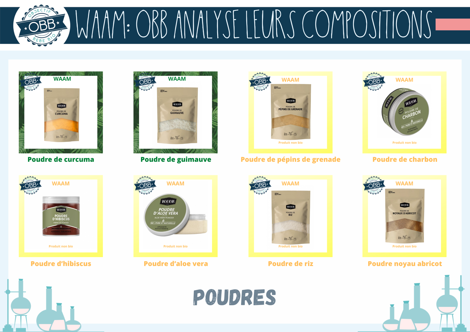 Il est tant de découvrir les produits les plus originaux de la marque: les formats poudres. En effet Waam propose différents produits nettoyants et masques pour le visage sous forme de poudre à reconstituer. Le shampoing et le gel douche sont compatibles avec la grossesse, l’allaitement et les enfants de plus de 3ans.