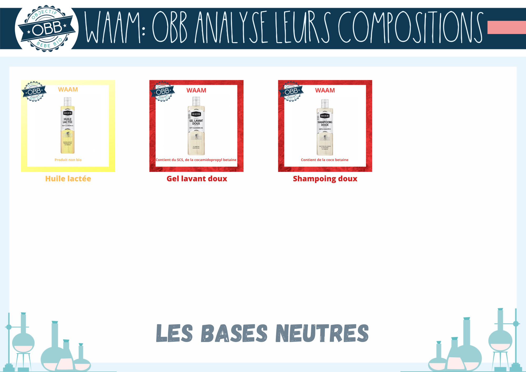 Voici la gamme de produit qui a fait le succès de la marque: les ingrédients pour les DIY. Comme pour beaucoup de gammes Waam une partie des références ne sont pas biologiques. Ils proposent également deux tensioactifs qui sont malheureusement irritants. Voici le lien de notre article qui détaille l’origine et le processus de fabrication du SLMI: