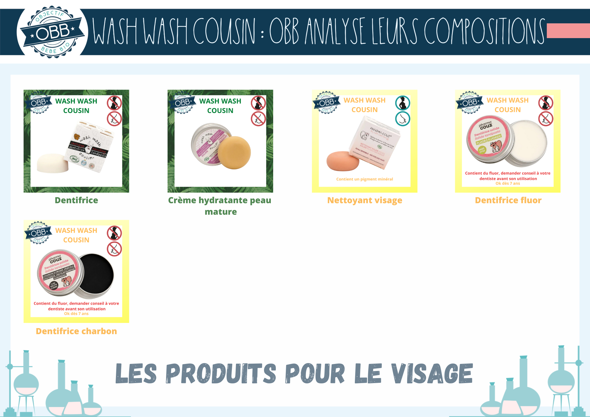 Wash wash cousin a développé au fil des années leur gamme de cosmétiques, notamment avec des soins pour le visage. Ils ont par exemple cinq crème hydratante solide, pour les différents types de peaux. Vous trouverez aussi des dentifrices avec ou sans fluor. Attention avec celui au charbon, en effet cet ingrédient peut être trop abrasif pour l’émail dentaire. Pensez à demander conseil à votre dentiste.