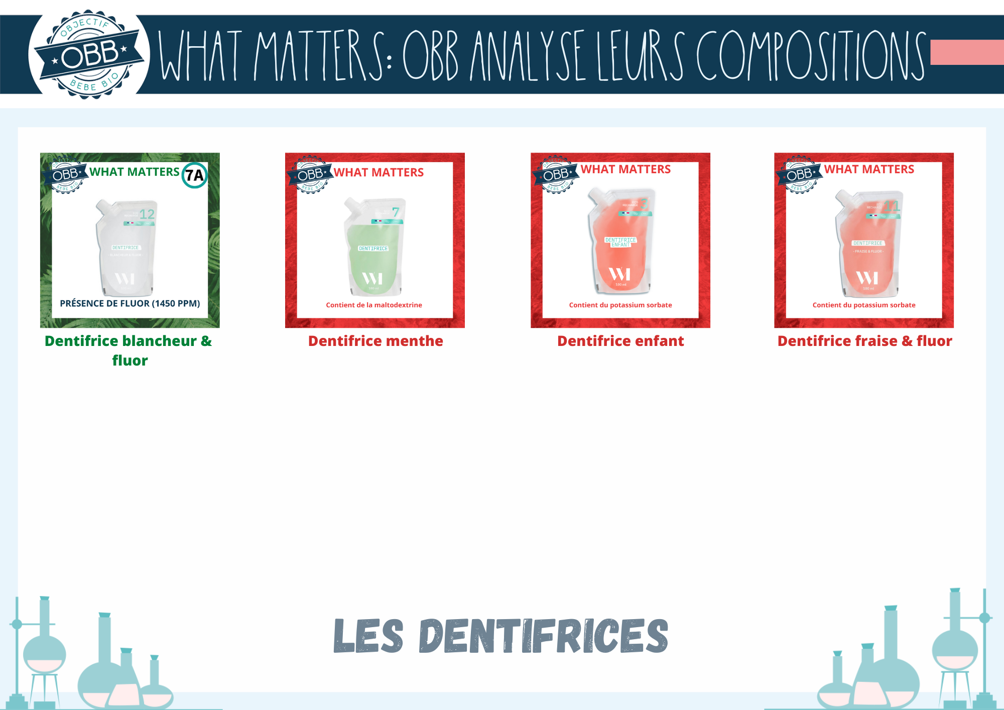 What Matters propose plusieurs dentifrices avec des saveur différentes. Ceux avec un arôme de fraise contiennent un conservateur irritant: du potassium sorbate qui est déconseillé en ingestion et en contact direct des muqueuses. Celui à la menthe contient de la maltodextrine. La version blancheur contient du fluor, comme toute supplémentation elle doit être encadrée par un professionnel de la santé.