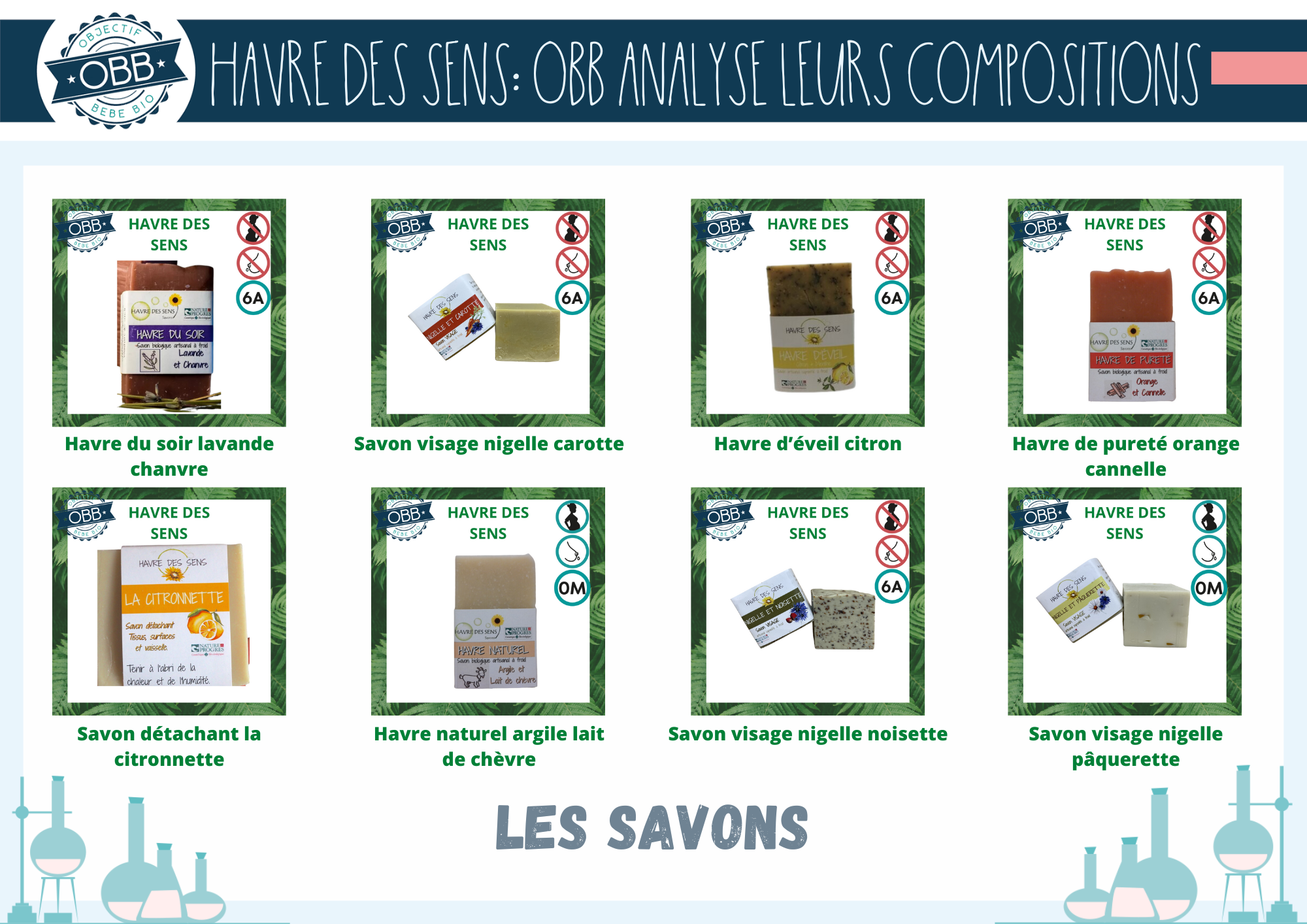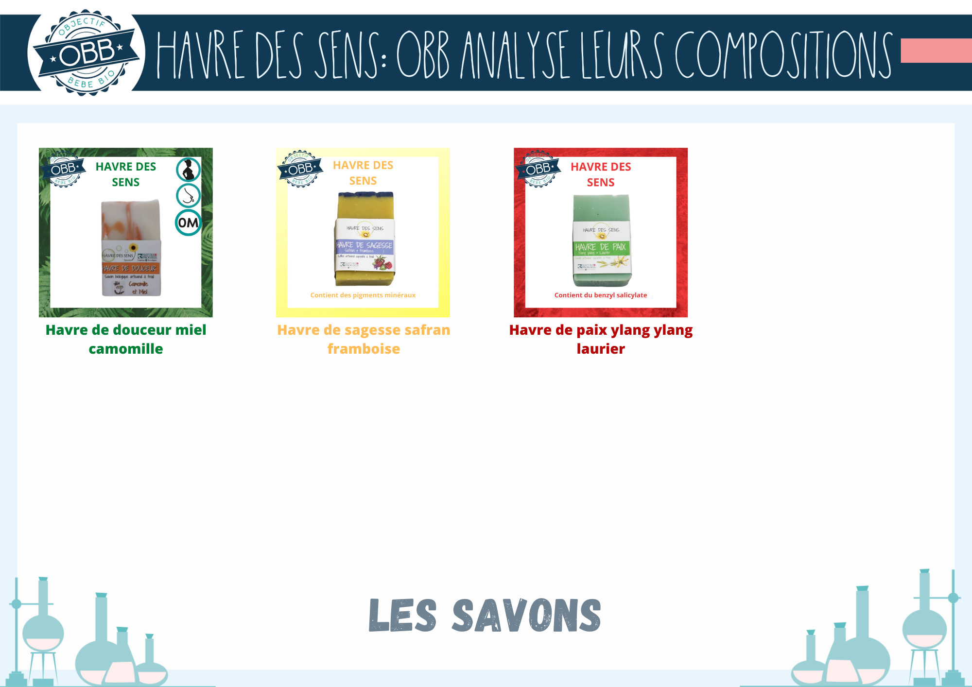 On le répète souvent mais chez OBB on adore les savons saponifiés à froid car ils cochent toutes les cases. Ils sont économiques, écologiques et la plupart du temps sans ingrédient problématique. Ce qui est le cas pour quasiment toutes les références de la marque. En effet seul le havre de paix contient du benzyl salicylate. Cet ingrédient se trouve dans certaines huiles essentielles, il est irritant et suspecté d’être un perturbateur endocrinien.