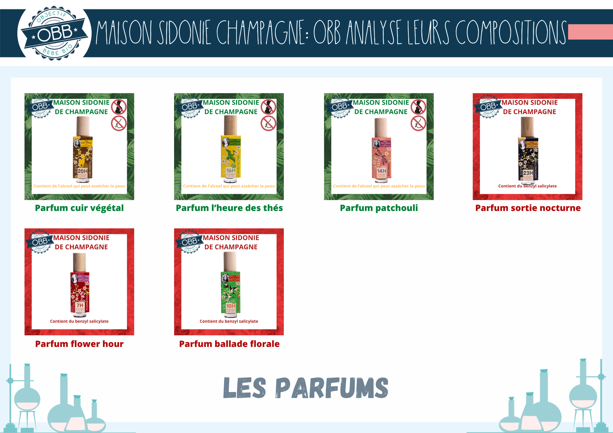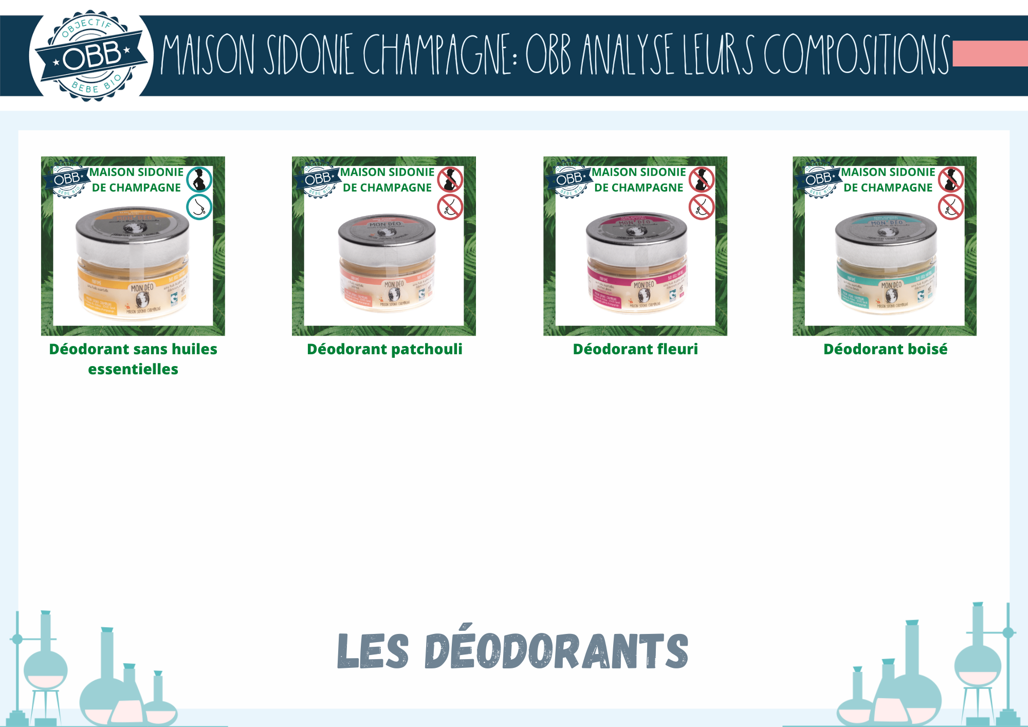 Vous trouverez ci dessous les différents déodorants et les parfums fabriqués par l’équipe de la Maison Sidonie Champagne. Les parfums sont 1000% bio, chose assez rare pour ce type de produit. Ils contiennent de l’alcool qui peut assécher la peau, donc nous vous conseillons de les appliquer plutôt sur un vêtement. Trois des références contiennent du benzyl salicylate qui est irritant et un perturbateur endocrinien suspecté.