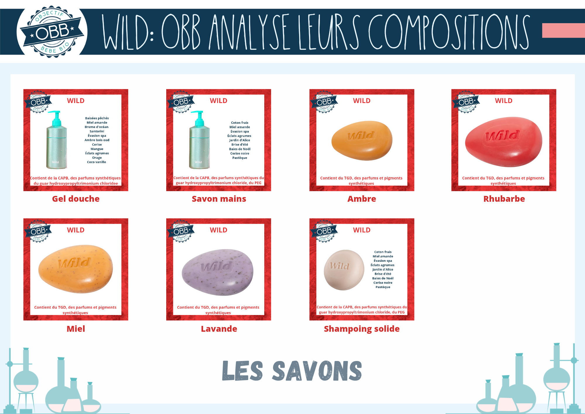 Wild a également développé des produits d’hygiène avec des savons solides, des gels douche, des savons pour les mains mais aussi des shampoings solides. En plus de la problématique des parfums synthétiques on retrouve des tensioactifs irritants comme la cocamidopropyl betaine. On remarque également la présence de PEG, qui sont fabriqués avec de l’oxyde éthylène un gaz cancérigène et mutagène.