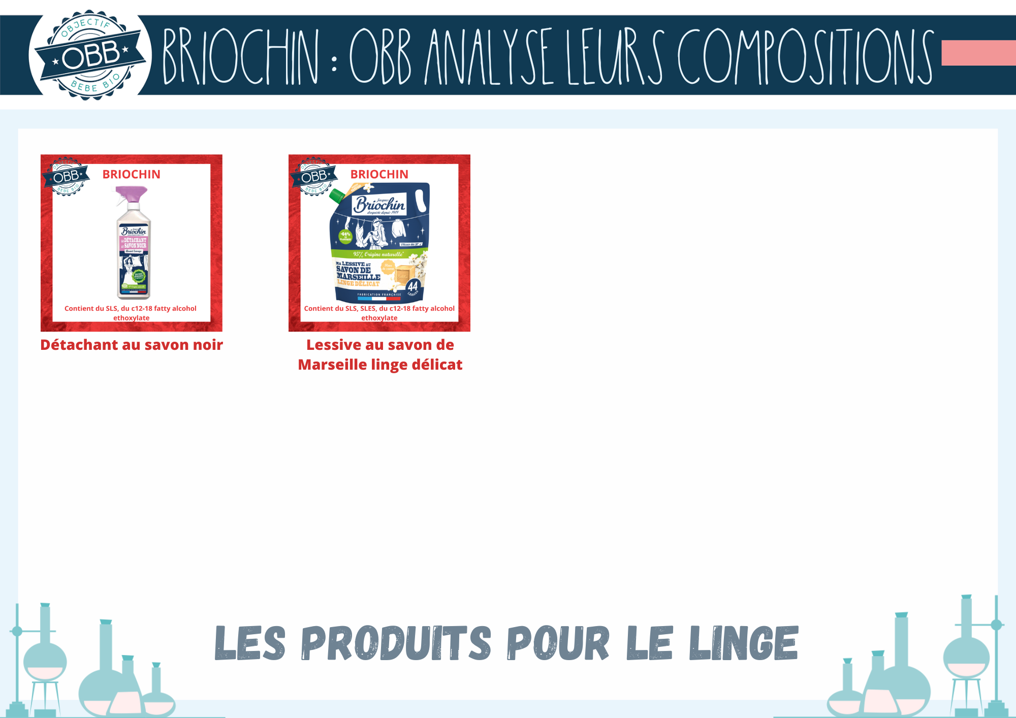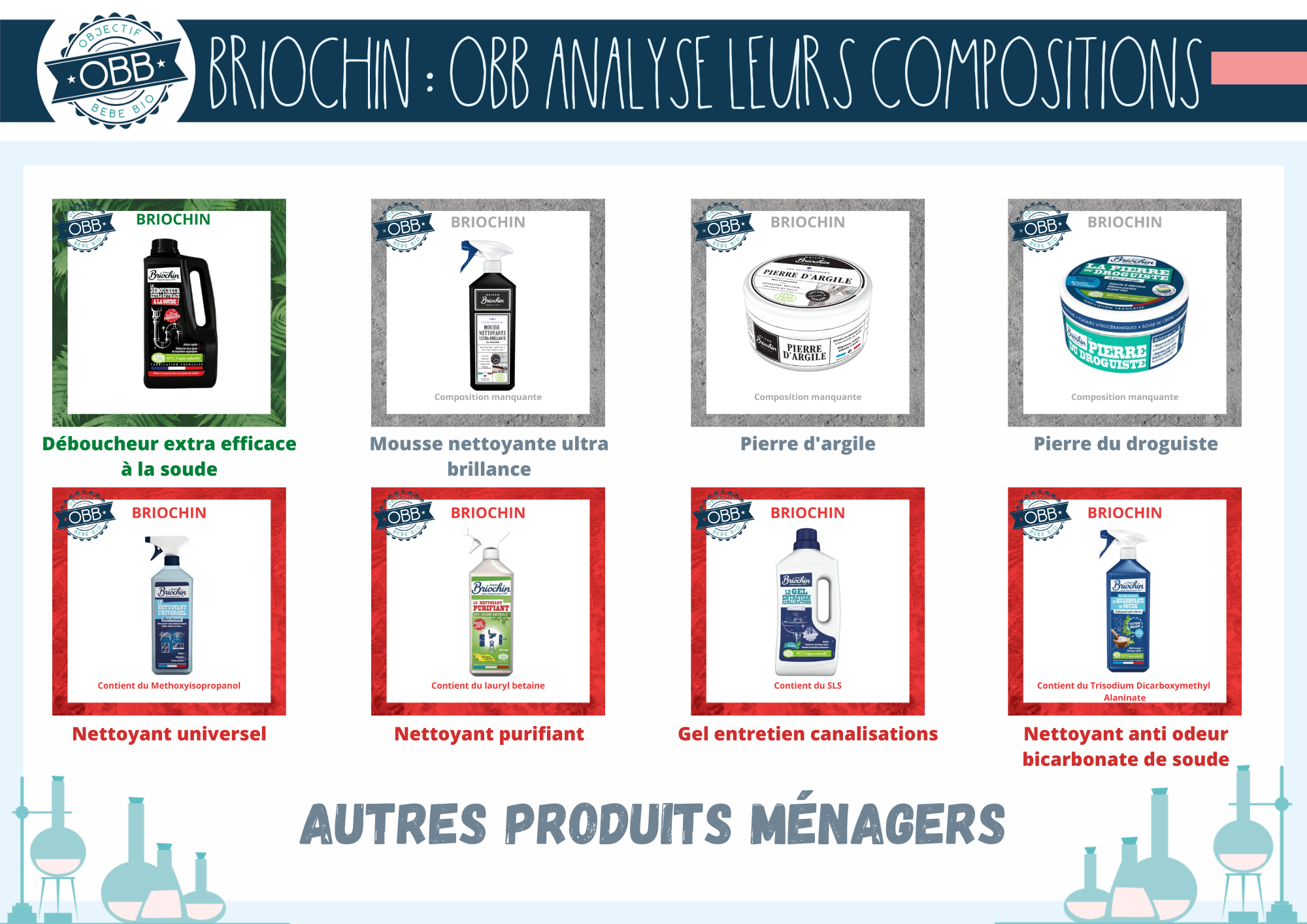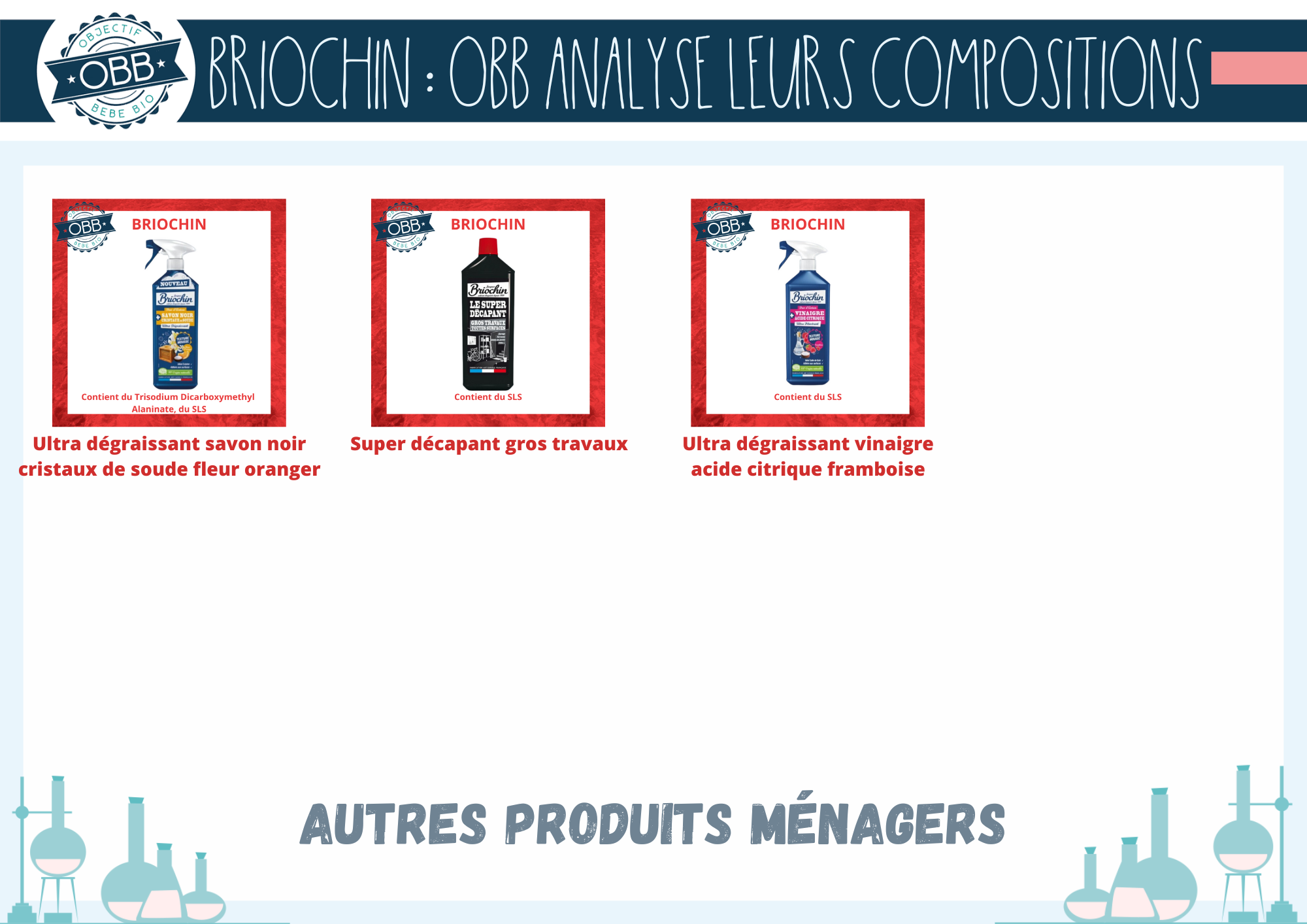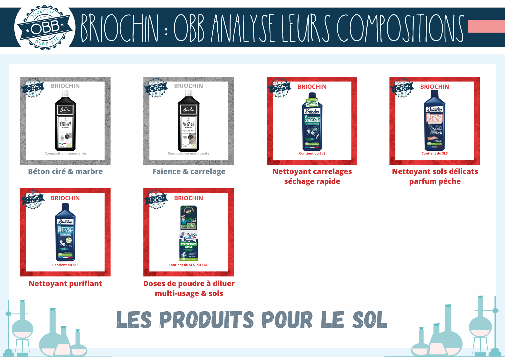 Tout comme les lessives, la plupart des nettoyants pour le sol Briochin contiennent du SLS, mais aussi du TDG pour le produit en dose à diluer.