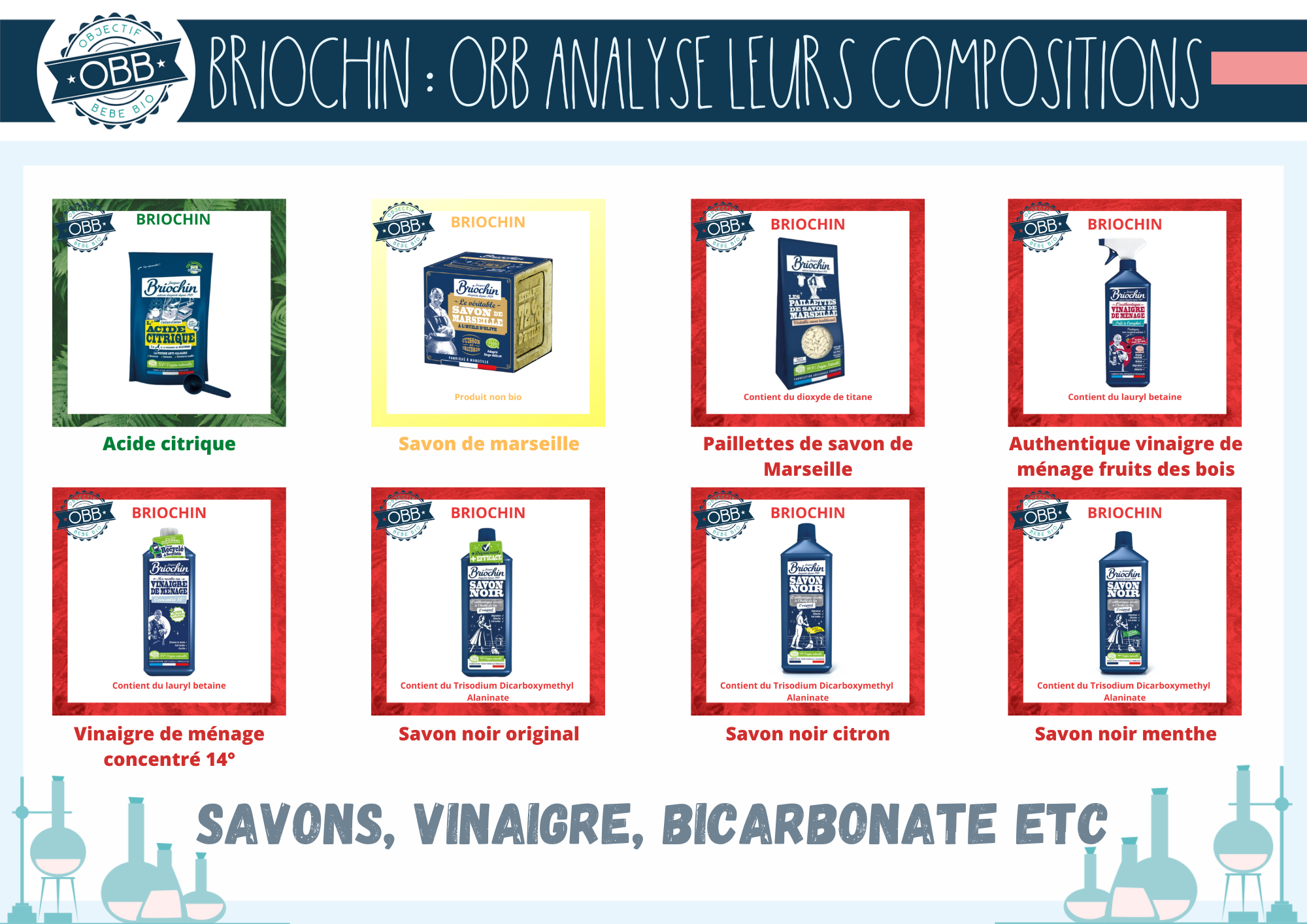 Bonne surprise pour les personnes qui aiment faire leurs propres mélanges pour les produits ménagers, Briochin a plusieurs produits qui correspondent à notre cahier des charges. On notera cependant, la présence de parfum pour certaines références, ingrédient non essentiel dans la compo de ce type de produit. On retrouve le même irritant dans plusieurs de leurs savons: trisodium dicarboxymethyl alaninate.