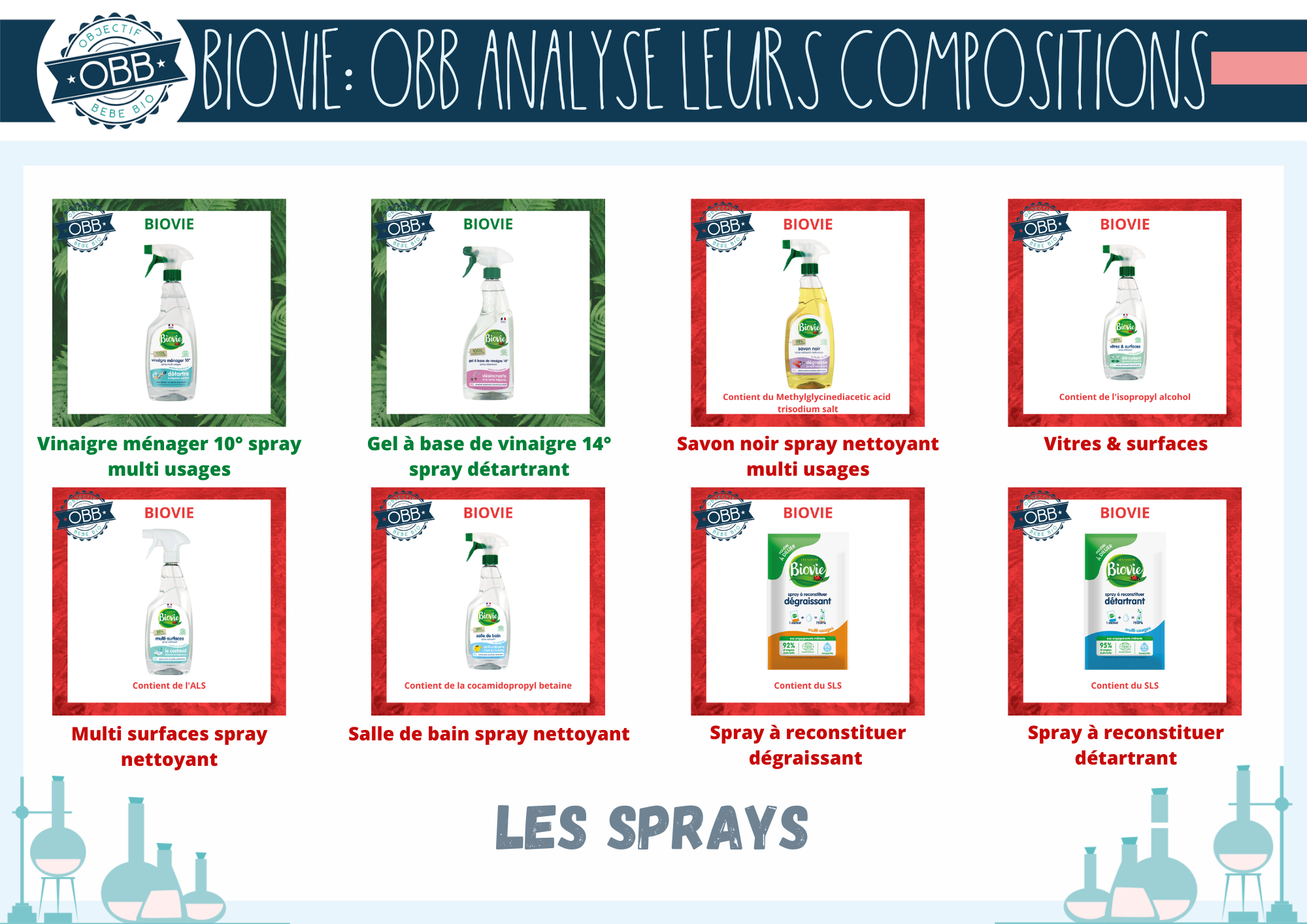 Biovie propose deux sprays à base de vinaigre, un classique et un avec un texture gel. Pour le reste des sprays, on retrouve dans leurs compositions des ingrédients problématiques comme l’isopropyl alcohol, l’ammonium lauryl sulfate, le SLS, ou encore la cocamidopropyl betaine.