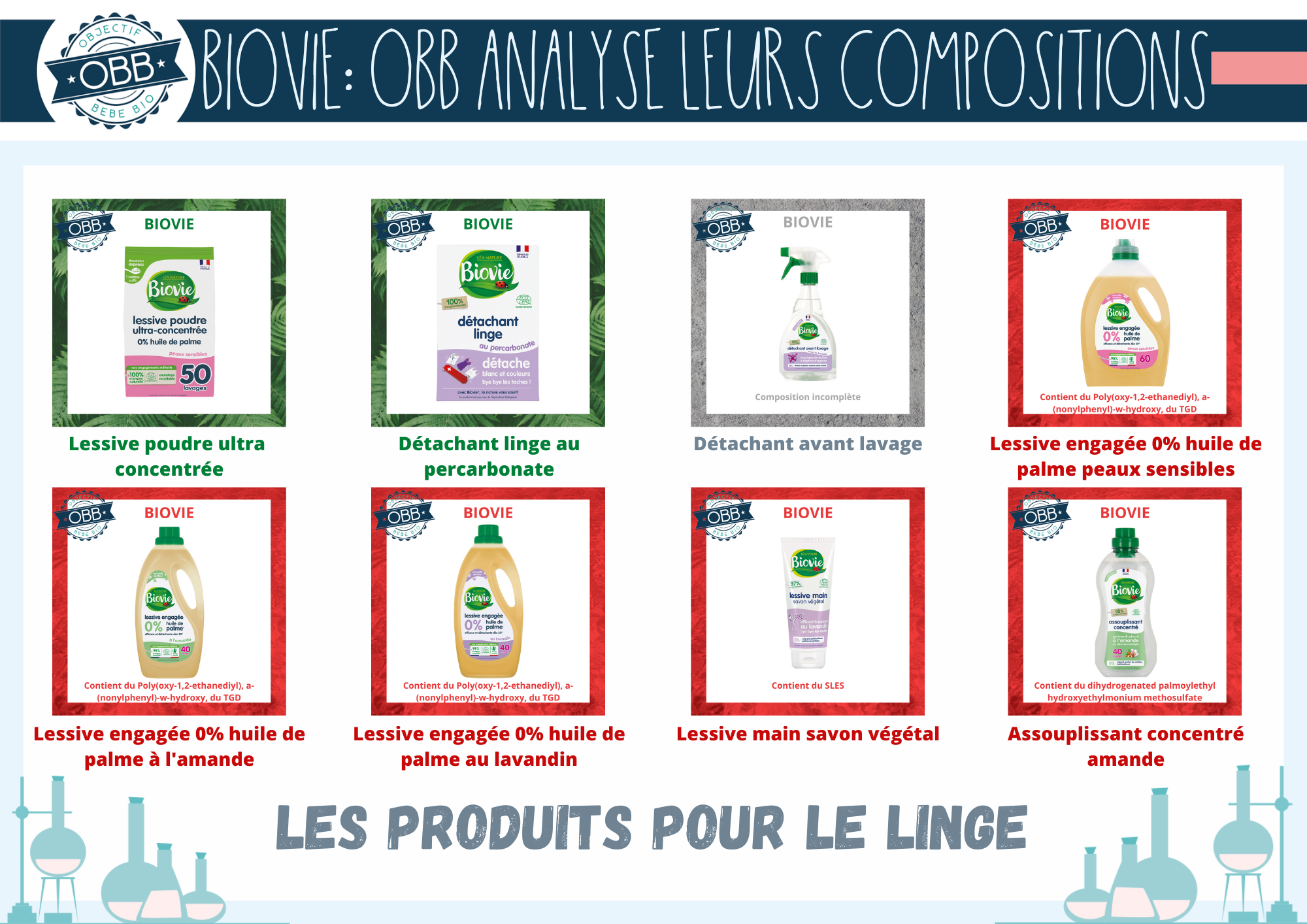 Parmi les lessives Biovie, seule la version en poudre est sans ingrédient problématique. Il s’agit de la même lessive que la marque greenweez. En effet, les deux font appel au même fabricant pour produire leurs lessives en poudre. En ce qui concerne les versions liquides ont y retrouve des ingrédients irritants et polluants comme le TGD. La marque propose une poudre détachante à base de percarbonate.