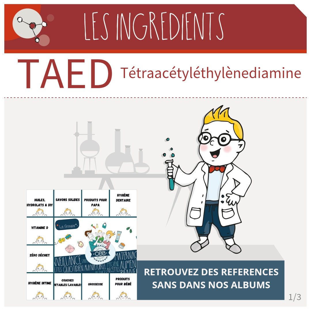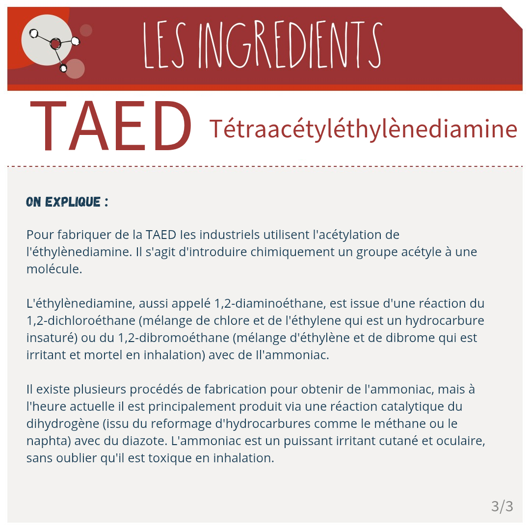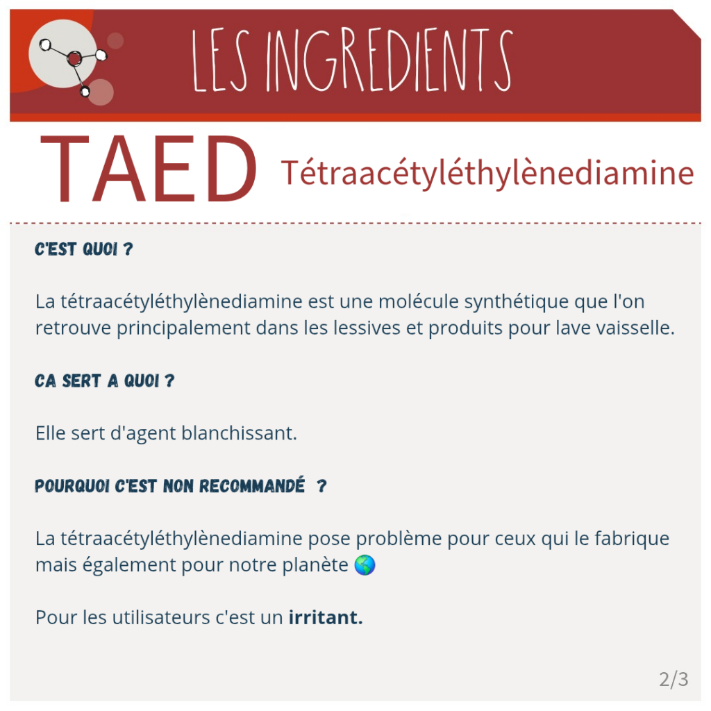 La tétraacétyléthylènediamine, appelée aussi TAED, est une molécule synthétique que l’on retrouve principalement dans les lessives et produits pour lave vaisselle.